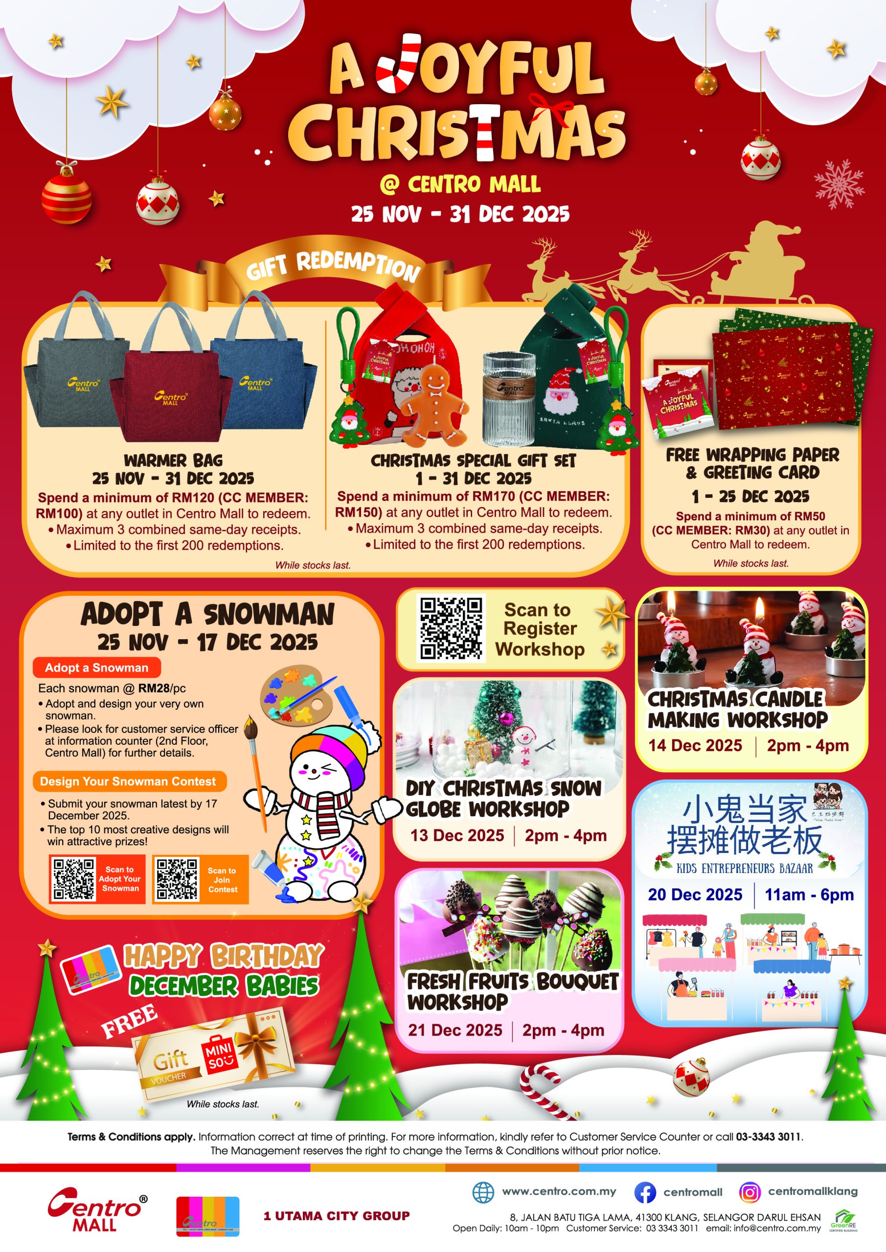This December, we’re bringing the community together with a series of festive activities, heartwarming workshops, exciting performances, and gift redemption — all wrapped in the spirit of joy and togetherness. For more info, kindly visit Customer Service Counter, 2nd Floor or call 03-3343 3011. T&C apply.