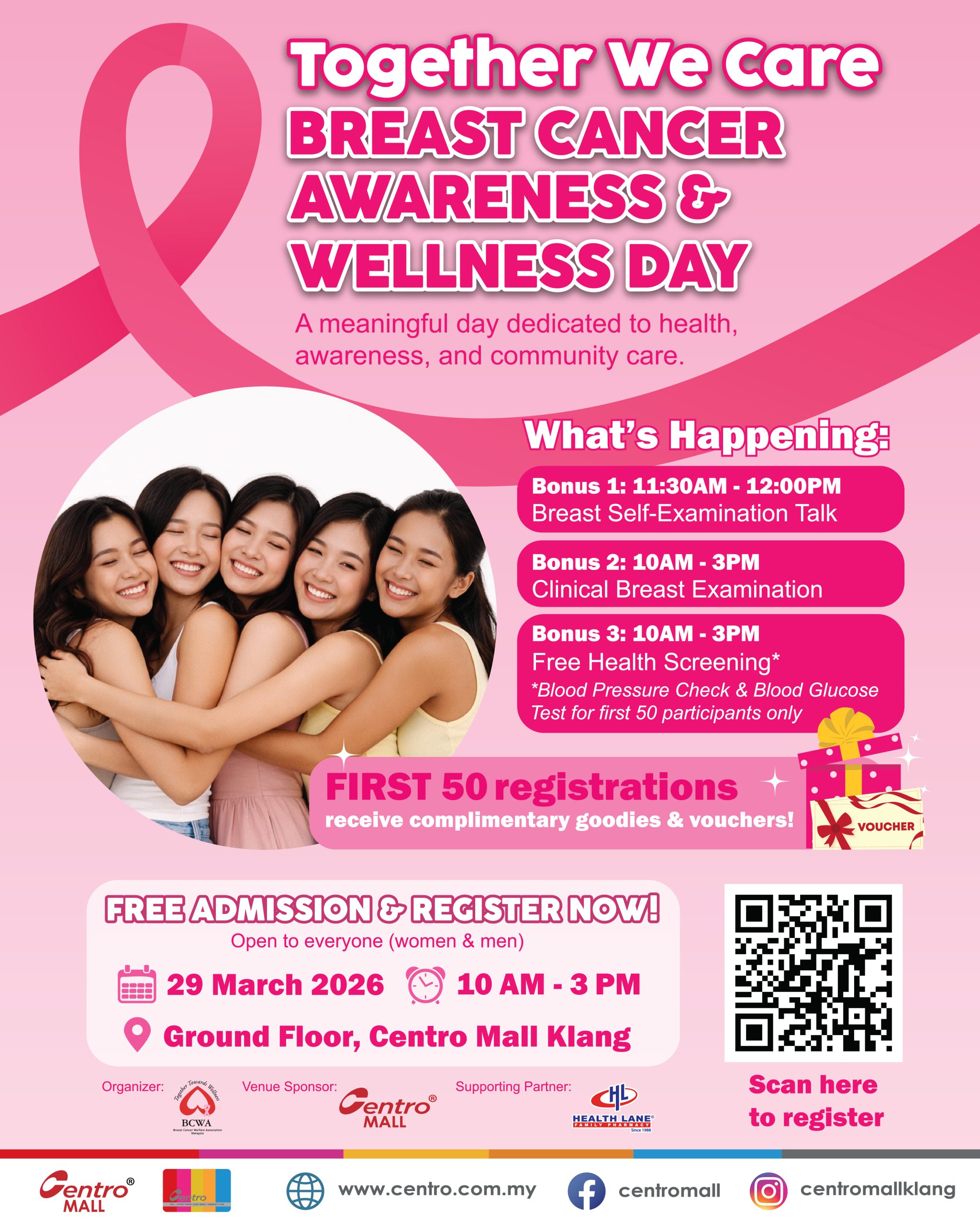 Join us for a meaningful day of health, awareness, and community care at our Breast Cancer Awareness & Wellness Day. 📅 29 March 2026 ⏰ 10AM – 3PM 📍 Ground Floor, Centro Mall Klang. Take a step towards better health with: ✅ Breast Self-Examination Talk ✅ Clinical Breast Examination ✅ Free Health Screening* 🎁 First 50 registered participants will receive complimentary goodies & vouchers! 🔗 Scan the QR code or click the https://forms.gle/R92sgKs5VPfKgs7NA to register now!