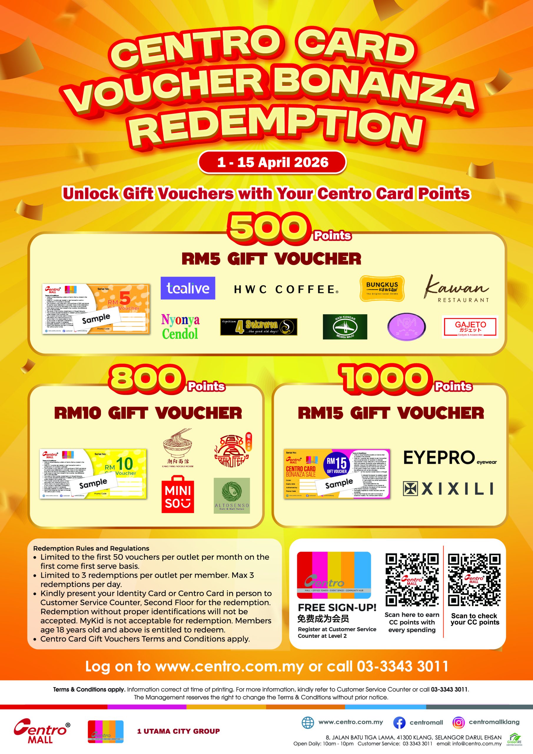 π Centro Card Voucher Bonanza is BACK! π Redeem up to RM15 worth of vouchers using your Centro Card Points! π 1 β 15 April 2026 β¨ Limited vouchers only! π³ Not a Centro member yet? Apply now and start earning rewards instantly! β° From 10AM to 10PM πRedeem at Customer Service Counter, 2nd Floor, Centro Mall